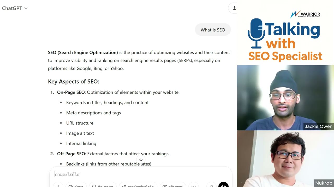 - มีการพูดถึงฟีเจอร์ใหม่ที่เหมือน chat GPT ที่กำลังทดสอบอยู่ ซึ่งอาจจะแสดงผลเป็นแบบถาม-ตอบด้านข้าง หรืออาจจะ แสดงผลเต็มหน้าโดยไม่มีลิงก์เว็บเลย คุณ Jackie ก็ยังไม่แน่ใจว่าจะเป็นอย่างไร ต้องรอดู
